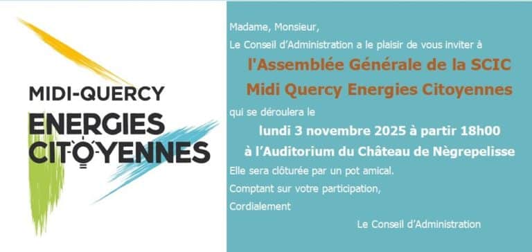 L’assemblée générale de notre SCIC SA « Midi Quercy Energies Citoyennes » se tiendra le Lundi 3 novembre 2025 à partir de 18 heures à l’Auditorium du
